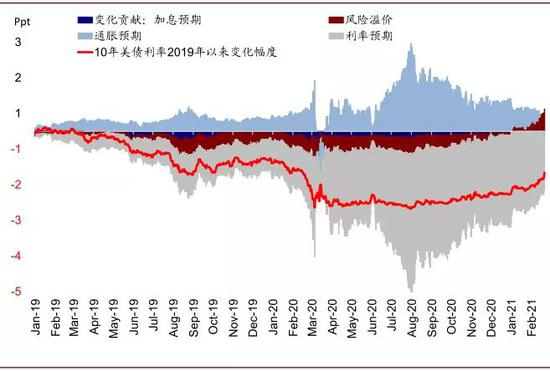 根据纽约联储ACM模型提供的测算数据,近期10年美债利率上行主要以期限溢价为主,也是其2018年以来首度转正,而且拆解不同期限后主要为2~3年期限,相反中性利率基本维持不变,这恰恰说明投资者预期未来更高的经济增长回报率进而导致期限溢价走高,而由于美联储在一段时间内仍将维持宽松,因此中性利率基本保持不变。这与我们在上文中提到的是实际利率驱动为主的情形一致。