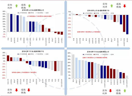 图表: 在类似于当前的实际利率上行 vs. 通胀预期上行这一阶段,板块层面,上中游周期品和下游消费品表现最佳,金融类板块表现表现一般,防御类板块表现最差