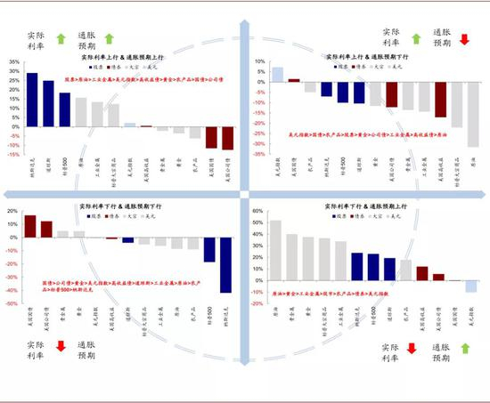 图表: 在类似于当前的实际利率上行 vs. 通胀预期上行这一阶段,股票市场表现最好,其次是包括原油和工业金属在内的大宗商品,而包括国债和公司债在内的债券类资产表现最差