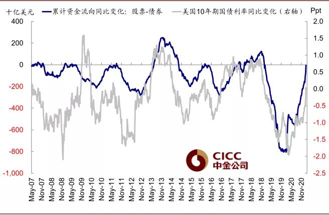 图表: 累计资金流向同比变化(股票 – 债券)vs.美国10年期国债利率同比变化