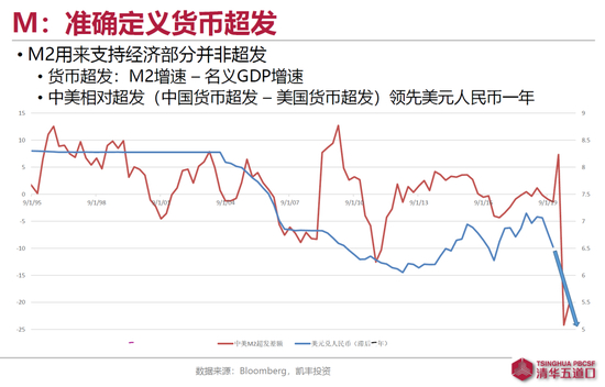 第二个看货币,如何定义货币超发?我给一个直观的定义,因为经济增长需要货币增长支撑,我们可以把M2增速与名义GDP增速的差额理解为货币超发。然后我们再把中美的超发互相减一下。这样子看93年到98年中国真的严重超发,这个超发跟92南巡粗放的发展有巨大关系。但自2001年以来,中美玩的基本是二人转。这个超发大概领先汇率变动一到两年。我个人绝对不会用这一个指标去做汇率交易,但其趋势性指向很有道理。去年美国M2增速高企,货币严重超发,按这个指引,美元人民币要去5以下。叠加前面我们看到美国的财政赤字问题,人民币相对美元升值就有了货币与财政的双重支撑。