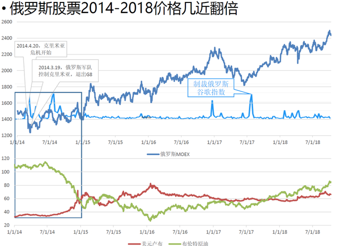 最后一点,为什么我觉得人民币和中国的资产好?便宜。便宜的主要有几类。第一是债券利率比美国高很多,第二是人民币本身,第三是被特朗普制裁的中资龙头公司。地缘担忧时,大家通常会高估欧美的力量,以俄罗斯为例,便宜很重要。俄罗斯经济体量只有广东省那么大,2014-2018年GDP平均增长0.5,俄罗斯的外贸依存度45%,比中国高很多,但是2014年入侵或者收回克里米亚之后被欧美制裁大跌后,从2014年底的位置到2018年翻了1倍,这个过程中油价与俄罗斯卢布基本稳定,持有卢布利率收益非常大。这个逻辑应用到中国更合适。
