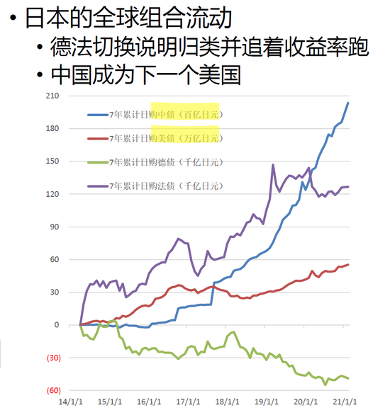 德法的例子可以作为代表,看日本人对利率的追求有多极致。2011年希腊危机,2012年德拉吉说出“whatever it takes”之后,欧洲债券开始安定,法国因为财政弱于德国,利率高于德国。因为日本人的分类里法债和德债在一个篮子里,而法债利率高几十个bp,从2014年以后,日本人持续抛售德债购买法债,截至去年底,这个量达到了12万亿日元。依此推断,日本会越来越多地在债券配置上向中国倾斜,把中国一部分放在跟美国等同的篮子里,当它认可中国的经济体和美国越来越接近的时候,其对中国债的购买量是巨大的,因为中国和美债的利率差实在太大,而日本实在太有钱了,包括日本多年累积的财富,以及日本央行印的130%多的GDP,合计约700万亿日元、7万亿美元或者40多万亿人民币。