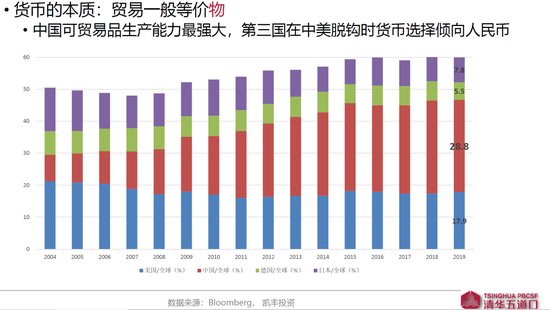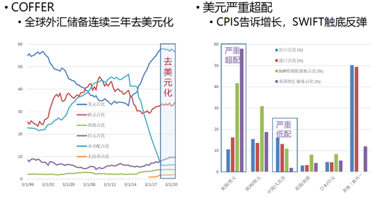 过去10年,中美类似的通胀水平通胀、类似的货币超发,但中国的制造业规模越来越大,人民币获得的支撑更强。之所以全球还是愿意持有美元,跟人民币汇率挂钩美元有直接关系。站在第三国角度来看,过去美元兑人民币波动极小,持有美元,可以完美保证对中国产品的购买力,而投资又方便很多,对比下来完全没有持有人民币的必要。但2015年汇改之后,美元和人民币的波动越来越大,第三国政府必须思考只是持有美元以后还能不能买到足够的中国产品?或者对于中国产品的购买力是不是依然确定了?答案是:不确定。因此,第三国会把一部分美元头寸换为人民币,这个变化才刚刚开始,量虽然还不大,但趋势转变的边际变化影响会非常大。有趣的是现在不光中国在主动促成这个转换,特朗普过去几年的所作所为也在促成这件事情,这是关于锚定转换的第一个角度。