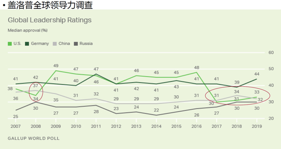 这个“信”也不仅仅是在国内,全球也一样。看盖洛普的《全球领导力》调查,上一次2008年危机时中国超过美国,然后奥巴马时代美国再次领先。特朗普上台后,2017-2018年中国持续上升均超过美国,19年基本持平。这说明全球对中国认可发生在同一阶段。不过,需要指出的是,这个调查2020年的在做,我估计届时中国又会落后于美国,可以说是羡慕嫉妒恨的驱动。2020年特朗普成功地抹黑了中国,而西方对疫情的管理又是如此失败,中国做的越好,其他人越是气愤,非常年份的民调很难谈理性。