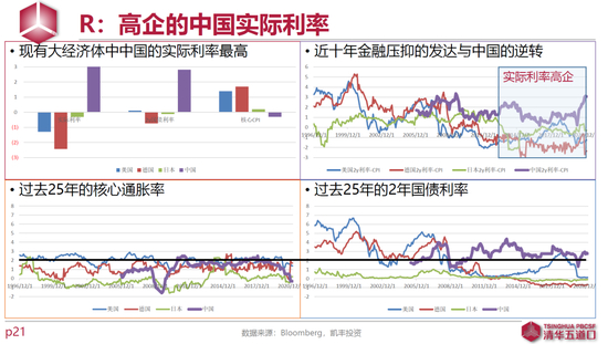 变的是发达国家的利率。过去25年两年国债利率,以西方国家通常盯住的2%通胀率为分界线,2008年以前极少低于这个水平,2008年以后几乎没有高过这个水平,现在德国日本都是负数趋势一路向下。不变的是中国的利率,一直在2的上下波动,2013年以来绝大部分时间高于2。2013-2018年中间有段时间中美实际利率与名义利率差的确有些收窄,恰好对应着人民币对美元贬值,这在利率上不能说完全没有道理,但绝对水平上,中国利率一直比美国高,而核心通胀率却差不多。现在中国的实际利率远远高于所有发达国家,在利率上构成人民币的核心吸引力之一。