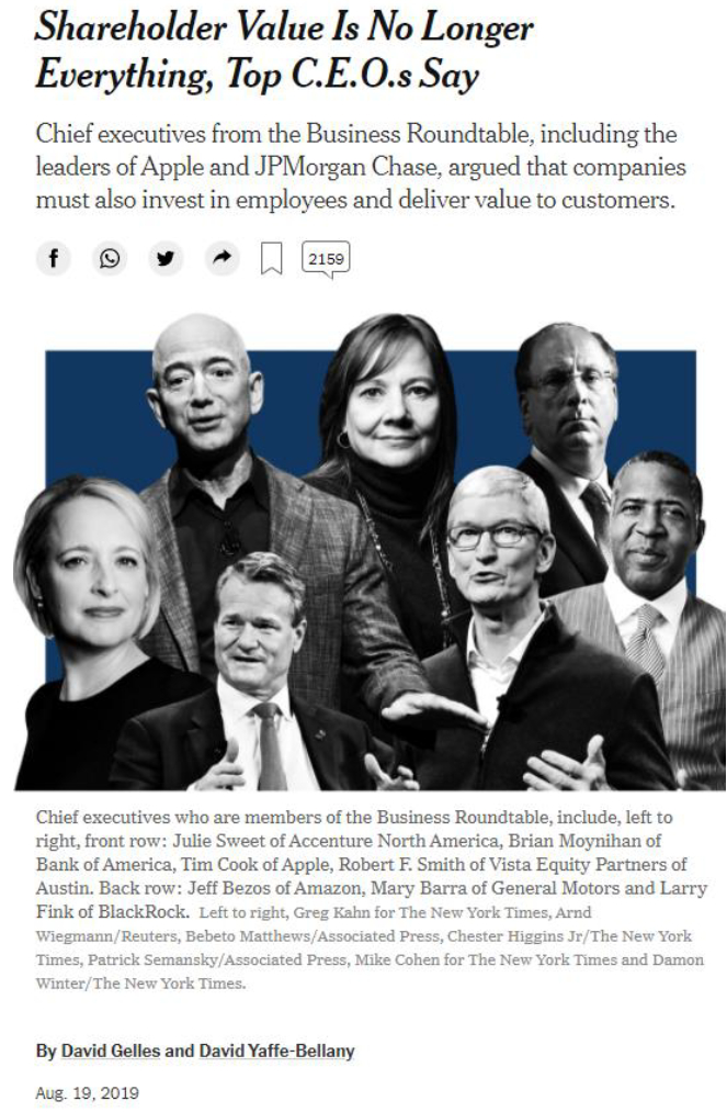 经济担忧一定会跟体制联系在一起,最近全球的变化也很大。不知道多少人关注,去年8月份的时候,美国200多个CEO出来,说以后股东利益最大化不是最重要的,而是要考虑雇员、客户,其实隐含的是整体利益最大化变得重要了。这是违反我们学过的公司金融的基本假设:只有股东利益最大化,社会利益才会最大化。这个说法出自美国让人意识到世界变了,变得更东方了。质疑的原因其中一个可能是贫富差距开始威胁稳定。另一个很热闹的是ESG投资开始兴起,ESG被美国投资者说的很高大上,但对我们来说,国企就很ESG,日本韩国的很多企业也很ESG。
