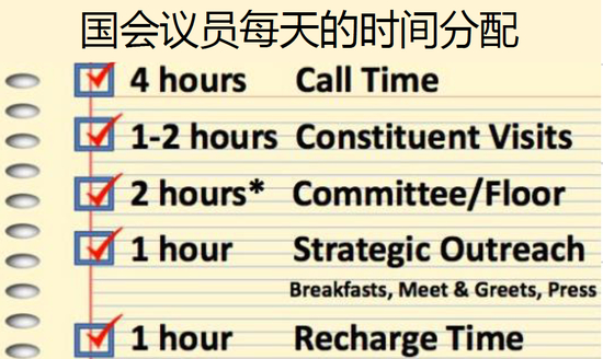据此,我们再深究下美国的选举政治。根据Huffpost的报道,美国国会议员每天的时间分配平均4小时在电话上为竞选募资,1个小时做战略接触,找一些大的潜在的支持者,可以买单的,吃早餐,见见面,见见媒体,这样一天五个小时的时间,超过一半的时间在干一些不务正业的东西。真正干事时间为两小时开会,1-2小时见自己的选民。还有一小时休息,喝咖啡什么的,整体算下来,一天正经工作时间不超过四小时,非常低。这里暴露了美国治理模式的一个自我加强的内耗,必须募到钱才能选上。导致竞选当选成为目的,而不是国家治理。