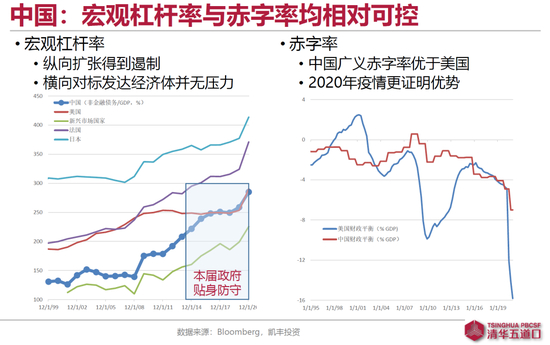 这个问题,我们还可以看财政赤字,如果把中美对比下,上世纪90年代以来,除了97年亚洲金融危机后到2000年左右,中国即使考虑到广义赤字,其赤字率也一直低于美国。2020年美国近16%的赤字,中国数字8%出头,低于疫情期间预期的10~11%。而今年美国政府赤字会再次突破10%,预计中国的广义赤字率会下降到7%以下。因为今年的名义GDP中国还是会超过美国,所以杠杆率相对美国还会下降。财政对比,中美相较,前者更可“信”。