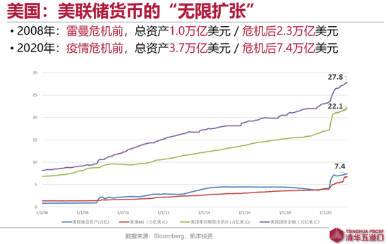 第一从货币的角度,什么是印钱?首先看央行,2008年危机之前,美联储总资产规模大约1万亿美元,危机之后很快到了2.3万亿美元,量化宽松1、量化宽松2、扭转操作然后量化宽松3,最后小幅量化紧缩收了一点,到2019年三季度末总资产3.7万亿美元,注意这比比以前高很多。2019年经济些许放缓,4季度美联储就已经开动印钞机扩表,结果疫情来了,迅速全面加码到2020年6月份就干到了七万多亿美元。这个印钱的速度不仅非常快,同时也带来M1,zero maturity money的大幅攀升,远超2008年之后的那一轮。同时美国国债规模上升也非常快,接存量已近30万亿美元,对比GDP大概是21万亿美元,这个比例几乎赶上了2010年希腊危机时的政府负债率水平。