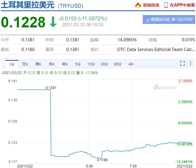在总统埃尔多安撤换中央银行行长令人震惊的决定之后,当天,土耳其里拉对美元汇率从7.2比1一度跌至8.4比1,土耳其里拉兑美元一度暴跌17%。接近历史最低水平。回吐这位前行长四个月任期内大部分的涨幅。后里拉小幅升值,截至当地时间凌晨4:00,里拉对美元汇率为8.06比1,仅仅4个小时内美元就对里拉升值了11.7%。