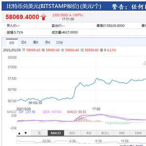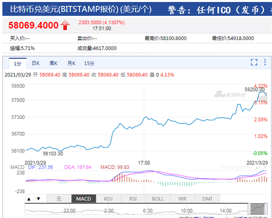 3月29日,比特币站上58000美元/枚,较日低回升逾3000美元。此前Visa宣布允许使用加密货币进行支付结算。