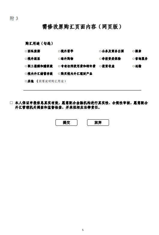 一、优化《个人购汇申请书》填报要求。为便于境内个人购汇填报,自2021年4月1日起(具体时间由银行自主确定,但最迟不得晚于2021年6月底),启用优化后的《个人购汇申请书》(见附件1)。已开办电子银行个人结售汇业务的银行,应按照《电子银行个人购汇优化技术要求参考》(见附件2),于2021年6月底前完成本银行系统改造。