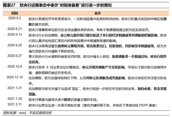 欧央行“鸽意”十足的政策态度可能进一步压制欧元。2021年3月的欧央行议息会议传达了关键要素,即“未来将在很长一段时间内保持货币宽松”。主要包括:1)维持当前利率水平不变(主要再融资操作利率0%、边际借贷便利利率0.25%水平和存款便利利率-0.5%),并预计未来将主要利率继续维持在当前水平甚至更低水平;2)提高下季度PEPP购进速度。此前在2020年下半年,欧央行放缓了PEPP的购进速度至每月千亿欧元以内,并一直保持在600亿欧元/月左右的水平(图表26)。3)欧央行还将2021年全年的通胀预期由1.0%上调至1.5%。但欧央行主席拉加德在会后的发布会上指出,1月和2月虽然通胀有所抬升,但是长期通胀预期仍然低迷。因此,欧央行称维持更长时间的货币宽松,也意在保护来之不易的通胀(图表27)。考虑到欧洲经济修复速度不及美国,欧央行大概率不会早于美联储收紧政策。