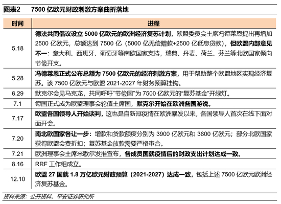 1、疫后7500亿欧元复苏基金曲折落地,市场对欧元区一体化前景信心增强。为了推动欧洲疫后经济复苏,欧盟各国经过反复协商,终于在7月21日就7500亿欧元复苏基金达成一致,其中3900亿欧元为赠款,3600亿欧元为低息贷款。具体方案的酝酿过程要从5月份说起。5月18日,德法两国共同提出一项欧洲后疫情时期经济复苏联合倡议,核心内容是建议欧委会通过资本市场借贷筹集5000亿欧元,建立一项“复苏基金”,重点用于缓解受新冠疫情冲击最严重的成员国的经济困境。欧盟委员会主席冯-德莱恩提出再增加2500亿欧元,总额达到7500亿,包括5000亿无偿赠款和500亿低息贷款。但欧盟内部出现分歧,意大利、西班牙、葡萄牙等南欧国家大力支持,而瑞典、丹麦、荷兰、芬兰等北欧国家倾向“节俭”开支。内部分歧使得财政刺激方案迟迟无法落地,7月17日欧盟各国领导人开始正式面对面谈判,经过4天的谈判“马拉松”,各方均做出适当让步,“复苏基金”方案终于达成(图表2)。