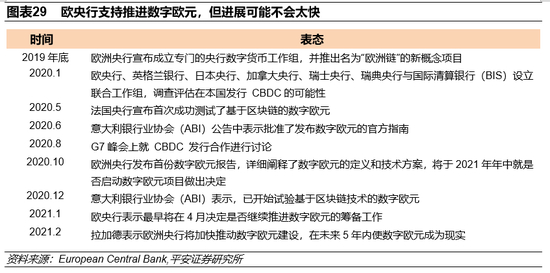数字欧元的推进可能是为数不多的“亮点”,但其落地时间不会太早。2020年全球央行对数字货币(central bank digital currency,CBDC)的态度进一步开放,主要发达国家逐渐重视央行数字货币的研发。2020年1月,六家全球主要央行(欧央行、英格兰银行、日本央行、加拿大央行、瑞士央行、瑞典央行)与国际清算银行(BIS)设立联合工作组,调查评估在本国发行CBDC的可能性。