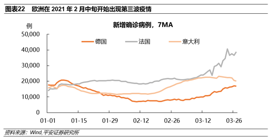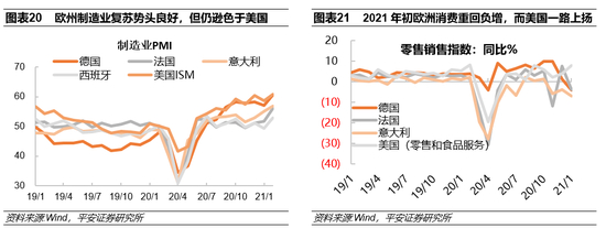 除了财政刺激,欧元区经济复苏可谓难寻“亮点”。进入2021年来,欧元区的疫后修复速度明显滞后于美国:从制造业看,欧洲国家虽然有良好的回升势头(德国制造业PMI已经超过60,意大利和法国也分别达到了56.1和56.9),但是恢复速度仍不及美国(图表20);从消费端看,由于疫情的反复,2021年欧洲国家零售销售同比水平没有维持住2020年末的水平,纷纷重回负增长,而美国1月零售销售指数同比增长了5.8%(图表21)。欧美经济恢复已经出现显著的节奏差,甚至有关欧美经济脱钩(decoupling)的论调开始频频出现。