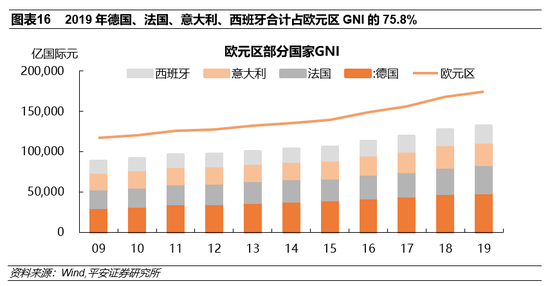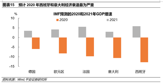 意大利、西班牙将成为获得赠款最多的两个国家:意西两国受疫情影响较为严重,2020年意大利GDP增速为-10.65%(2019年增速为0.3%),在欧洲主要经济体中仅好于西班牙的-12.83%(2019年增速为 2%,图表15)。根据意大利前总理孔特在欧盟7月峰会会后采访中的表态,在7500亿欧元的分配中,有2090亿欧元将分配给意大利,占总额约28%,其中约810亿欧元为赠款,孔特对这一数字表示满意。另据报道,西班牙将获得1400亿欧元的资金支持,占总额约19%,其中约722亿欧元为赠款。