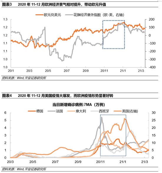 2、2020年末欧洲经济相对美国复苏加快。以欧洲和美国的花旗经济意外指数累计值之差衡量欧美经济相对恢复速度,可以发现该差值在2020年11月中旬由负转正(图表3)。2020年末前正值欧洲二次疫情高峰已过,而美国仍处在“单日新增新高”阶段(图表4)。再加上美国大选带来极大的政治因素干扰,而欧元区更加专注于经济恢复的进程。因此,欧洲相较于美国经济复苏更快,欧元兑美元随之走高。