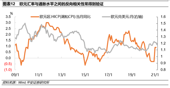 欧元的大幅升值对其通胀有明显的抑制作用。一个经济体货币对外升值,意味着进口商品价格降低,本国货币购买力增强,从而有助于压低国内通胀水平。长期来看,欧元汇率与通胀水平之间的反向相关性得到验证,欧元汇率和HICP同比的拐点之间在多数时间上吻合(图表12),欧元升值的几个时点均对应通胀的低迷期(2009年、2014年上半年、2020年下半年)。而目前欧元区(乃至发达经济体)面临的是通胀长期偏低的问题,欧元升值抑制通胀,更加不利于实现欧央行2%的通胀目标。