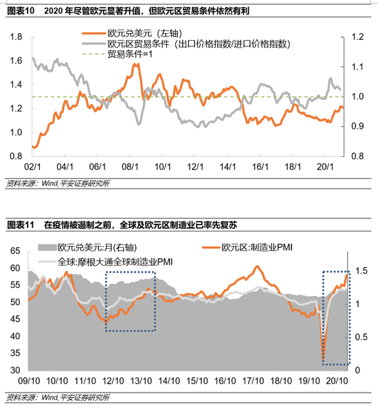 汇率与出口同向上行,原因可能有二:一是贸易条件良好。以出口价格指数/进口价格指数衡量的贸易条件指数,虽然在2020年中从高点1.06稍有回落,但仍高于水平值1,说明外贸对欧元区仍然有利(图表10)。二是全球制造业恢复势头较好。2020年5月以来,全球制造业PMI强势回升,制造业更好适应了与疫情共生。在此过程中,欧元区制造业PMI回升势头更显强劲。由于欧元区制造业出口占商品出口总额的比重较高(2019年欧元区制造业出口占商品出口比重为78.3%,美国的这一数字为59.11%),全球制造业复苏对欧元区出口产生了有力促进。如果我们找一个历史对照点,可以发现在2012年末-2014年初的阶段同样经历了欧元区出口与汇率同升的阶段,而且也具有欧元区制造业PMI更快上行的特征(图表11)。