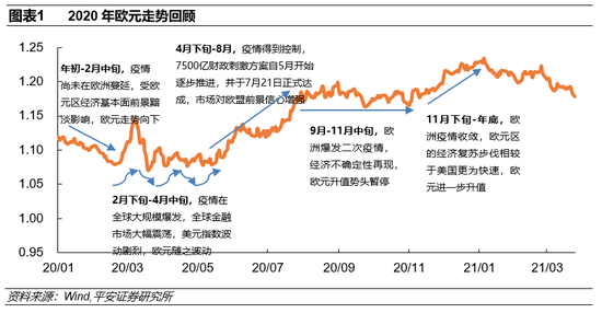 1.从2020年欧元大幅升值谈起。总结2020年欧元升值过程,欧洲一体化财政刺激方案推出、欧美疫情形势演变、欧元区相对经济表现,在不同阶段对欧元走势产生了重要影响。欧元区经济在去年一季度受新冠疫情重创,但在欧盟各国的财政刺激以及宽松的货币环境下,2020年欧元区经济前景不断“拨云见日”,且经济复苏的速度在全球主要发达经济体中相对领先,为欧元升值提供了动力和支撑。