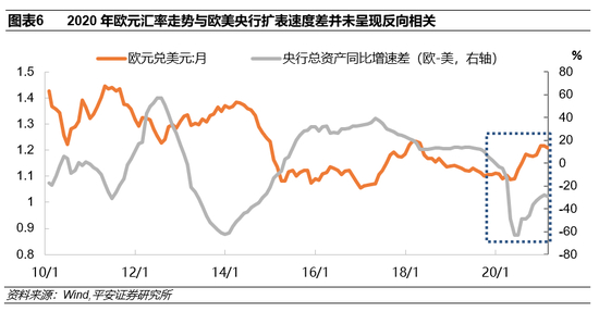 4、欧央行和美联储货币宽松差异的影响似不显著(图表6)。2020年3月23日,美联储宣布将按需购进国债和MBS,通过无限量化宽松政策确保市场平稳运行。而欧央行宽松政策则相对谨慎很多:欧央行在3月12日的议息会议后宣布,将推出包括长期再融资操作(LTROs)、追加1200亿欧元量化宽松等手段,以应对疫情对欧元区经济的冲击。这使得欧美央行扩表速度出现差异。历史上,欧美央行资产负债表增速差与欧元兑美元汇率存在反向相关性。但2020年欧美央行之间的扩表增速差并没有推高欧元:3月-5月底,美联储和欧央行资产负债表同比增速差不断扩大,但这一阶段欧元兑美元并没有明显升值,而是在1.08-1.12之间波动;6月初,美联储和欧央行扩表增速差有所收敛后,欧元反而不断走高;全年来看,欧央行和美联储货币宽松进度和欧元走势在时间上并不吻合。