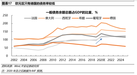 2)“怎么还”:“能力越大责任越大”,德国的意愿至关重要;还款时间最迟到2058年。复苏基金中属于赠款部分的3900亿欧元由欧盟偿还,筹措资金的方式包括提高欧盟会费率占GNI的比重至2%(原先为1.4%)、征收环保税等,因此德国、法国等国由于总收入水平较高而可能需要承担更大的“还款责任”(图表16)。复苏基金中3600亿欧元的借款部分,则由各受益国自行筹措资金偿还,根据欧盟官网公布的欧盟特别峰会共识,这笔借款的还款日期最晚可到2058年。对于各国自行筹措还款资金的部分来说,还款不可避免地会增加自身财政压力,尤其是希腊、意大利、葡萄牙等国。但是,向欧盟借款的成本要比其自行发债的成本可能更低:一是,考虑到希腊、意大利、葡萄牙等国的长期国债收益率都在0.6%以上,在欧盟属于较高水平;二是,因为这些国家的债务率普遍较高(图表17),又有欧债危机的前车之鉴,与其自行发债筹措资金,不如依靠欧盟的低息贷款支持来得相对容易。