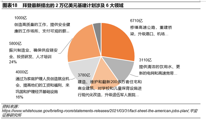 美国“1.9万亿抗疫救助法案+2万亿基建计划”,相比之下欧洲的财政刺激显得逊色。2021年3月10日,美国众议院以220票赞成、211票反对通过了1.9万亿美元的新冠纾困救助法案。3月11日,美国总统拜登签署了1.9万亿美元的新冠纾困救助法案,法案正式作为法律生效。3月31日,拜登在讲话中又公布了一项高达2万亿美元的基础设施计划,待进入国会立法程序(其中存在较大不确定性),其内容涵盖6大领域,计划在未来8年内,每年投资约2500亿美元(约合美国GDP的1%),以期实现升级基础设施、振兴制造业、投资基础研究和科学等目标,并称庞大的基础设施计划将创造“数百万个就业机会”(图表18)。在美国的“1.9万亿+2万亿刺激计划”之前,美国应对新冠疫情的财政支出就已占其2019年GDP的16.7%,而德法意西的这一比重分别为11.0%、7.7%、6.8%和4.1%(不包含前述7500亿欧元分配到各国的部分,图表19),已经远逊色于美国的“大手笔”。若再将新计划考虑在内,欧洲的财政刺激规模相比美国更是“小巫见大巫”。