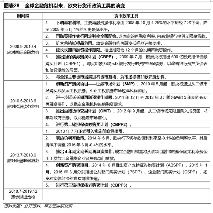 欧央行干预汇率的方式亦有限。欧央行的货币政策工具主要包括负利率政策(NIRP)、资产购买计划(APP)、利率前瞻性指引(FG)、以及定向长期再融资工具(TLTRO)。梳理2008年全球金融危机以来欧央行的货币政策可以发现,欧央行的货币政策工具包里,专门针对汇率干预的工具并不多见(图表28)。比较过去10年欧元兑美元走势和欧央行相对美联储扩表速度,可以发现二者负相关的趋势在绝大多数时点得到验证(图表6)。这意味着,量化宽松仍是欧央行汇率干预的最常见且有效的做法,也说明本次欧央行更加鸽派的表态很可能起到压低欧元汇率的效果。