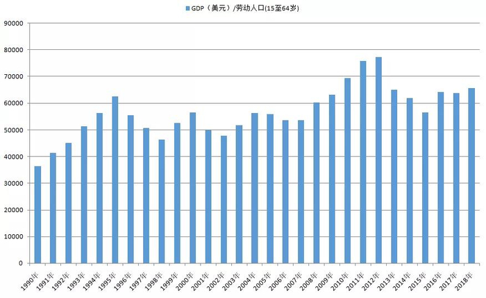 1990年日本的GDP为3.13万亿美元,劳动人口为8605万,单位劳动人口的经济产值为3.64万美元;