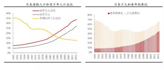 日本60岁以上人口占比迅速增加:60岁以上人口占比从10%提升到20%用了28年,而从20%提升到30%只用了14 年。到 2016 年,日本60岁/65 岁以上人口占比分别为33.7%、27.3%,远远超过国际惯例的10%和7%。