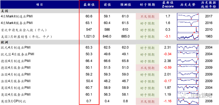►基本面与政策:美国4月PMI再创新高。美国4月Markit制造业PMI初值 60.6,高于前值(59.1)但不及预期(61.0);服务业PMI初值63.1,高于前值(60.4)且大幅高于预期(61.5)。欧洲4月PMI初值也普遍改善。