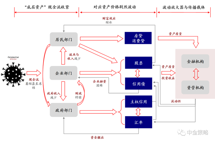 图表22: 疫情影响的金融传导机制:实体经济三个部门“底层资产”现金流收紧