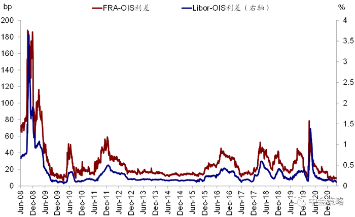 图表16: Libor/FRA(Forward Rate Agreement)-OIS虽然疫情期间一度攀升,但远低于2008年金融危机时水平,与当时金融机构杠杆破裂导致的危机完全不可同日而语