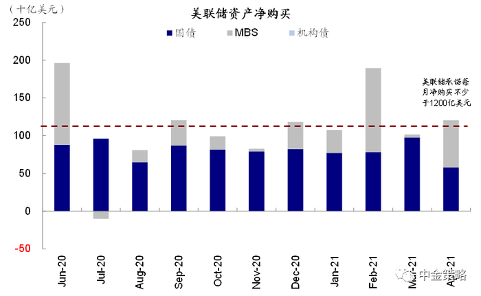 图表2: 美联储仍在以每月至少800亿和400亿美元的速度购买国债和MBS,不过二阶导数已经开始回落