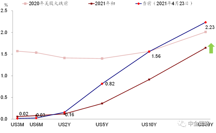 图表14: 近期美债利率剧烈动荡主要是以长端利率为主,短端利率如2年期以下基本维持不变,这也使得美债收益率曲线持续陡峭化