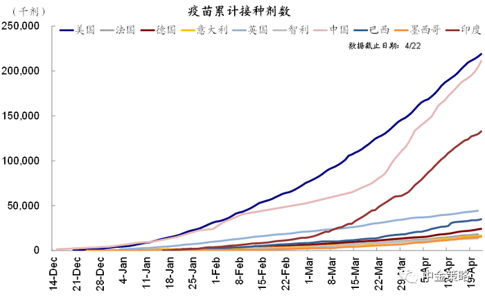 ►疫情与疫苗监测:美国新增确诊下降、接种放缓。疫情方面,过去一周美国新增确诊数据下降到5.9万人,欧洲国家意大利、法国和英国新增确诊持续下降。印度和土耳其新增确诊人数在前期指数型增长后本周小幅回调。疫苗方面,美国批准强生疫苗的继续使用,疫苗接种高峰后降速(平均295万每天),多数州完全接种疫苗人数已经超过30%。新兴市场中巴西日均接种从上周100.4万剂下滑到43万剂,印度从326.9万剂下滑到221.8万剂,中国本周接种加速。复工进展,本周美国公交出行和返工数据均有所提升,但TSA安检数据小幅下滑。欧洲中除法国外,西班牙、意大利和德国公交出行抬升,返工数据改善。新兴市场中巴西改善,印度下滑。