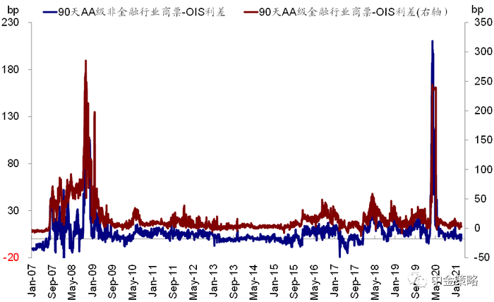 二、从价的维度,根据流动性传导路径、不同融资主体和是否涉及信用风险等维度分为:国债市场(利率和曲线)、银行机构之间(Libor-OIS和FRA-OIS利差)、金融机构和集合投资机构等(回购市场)、非金融企业的短期(商业票据市场)和长期融资市场(信用债市场)、海外市场(美元互换)等几个层次。