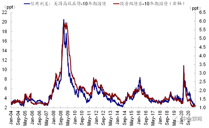 2. 国债与信用债发行。国债与信用债发行既反映供给端的压力,例如美国新一轮财政刺激可能带来的新发国债需求,也能反映市场供求关系是否健康,例如在疫情期间,由于信用债市场的动荡,新发行一度冻结,严重影响了企业的正常融资需求,直到美联储决定直接购买信用债才逐渐稳定市场信心,使得信用债市场逐渐恢复正常,信用利差也得以大幅回落。