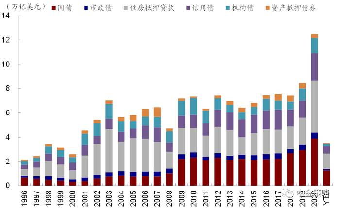 图表7: 2020年全年美国固定收益产品总发行规模高达12.5万亿美元,是2019年的1.5倍;2021年前三个月,整体3525亿美元的发行规模已经是去年同期的1.4倍