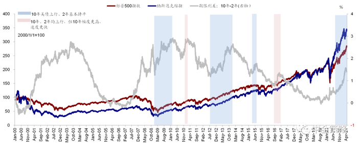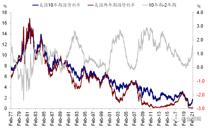 在近期美债利率的剧烈动荡中,我们注意到主要是以长端利率为主,短端利率如2年期以下基本维持不变,这也使得美债收益率曲线持续陡峭化(熊陡)。根据历史经验,这种以长端利率为主的收益率曲线陡峭化往往对应的宏观环境是经济复苏扩张、而流动性尚未收紧的阶段,因此很少出现系统性的熊市(《收益率曲线陡峭化的含义与影响》)。而等到短端利率开始逐步上行导致收益率曲线进入熊平阶段,市场面临的压力和波动会开始逐渐增多。