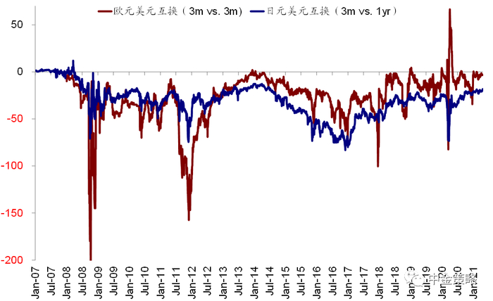 图表21: 欧元和日元与美元互换利率明显处于历史低位,表明近期美债利率走高和美元走强对于全球美元流动性也并未产生明显扰动
