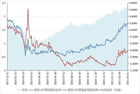 大规模的财政刺激引发了市场对美国通货膨胀抬头的预期。美国10年期通胀指数国债(TIPS)收益率通常被看作美国国债的实际收益率指标,其与美国国债名义收益率之差,被投资者看作美国年通胀率的预期。具体来看,2021年3月31日,美国10年期通胀指数国债(TIPS)收益率为-0.63%;美国10年期国债收益率为1.74%,这意味着盈亏平衡通胀率(二者息差)已经接近2.37%。而在2020年12月31日,盈亏平衡通胀率仅为1.99%。投资者对美国通胀预期的上升带动美国10年期国债收益率的上升。后者从2020年12月31日的0.93%,涨至2021年3月31日的1.74%,上升了81个基点,涨幅达87%(见图3)。