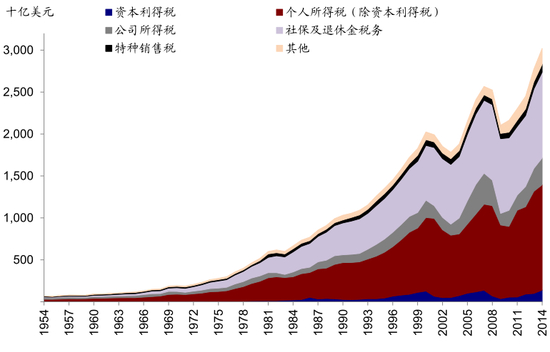 图表: 个人所得税和社保及退休金税务长期以来是美国税收的重要组成部分