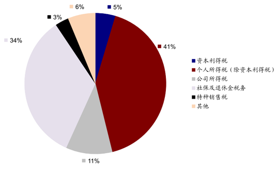 图表: 根据TPC及财政部的统计,截止2014年末,资本利得税税收占比为5%,个人所得税(除资本利得税)占比达41%