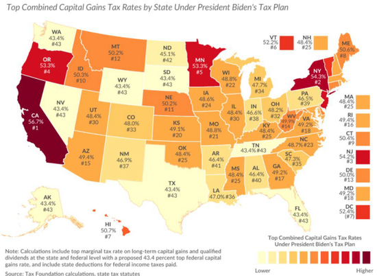 图表: 拜登计划提高资本利得税率后各州将会达到的最高税率