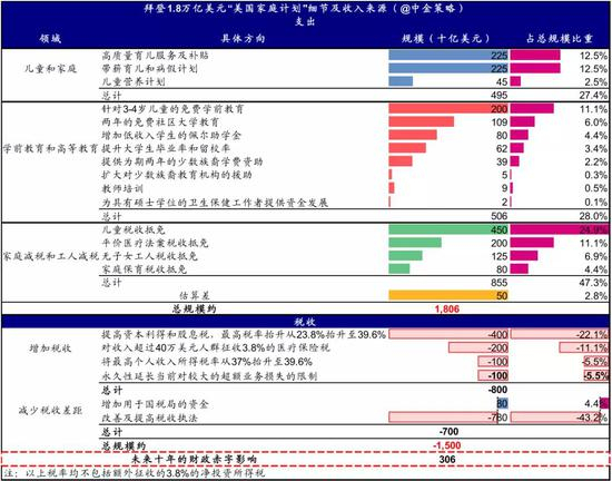 支出方面,总计安排10年1.8万亿美元的支出,主要集中在家庭、儿童和教育支持上: