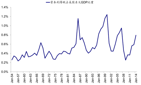 图表: 资本利得税占美国名义GDP比重从历年波动较高