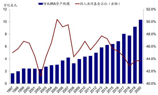 图表: 过去三年,传统IRA资产规模不断抬升,投入共同基金的比例也在逐步抬升…